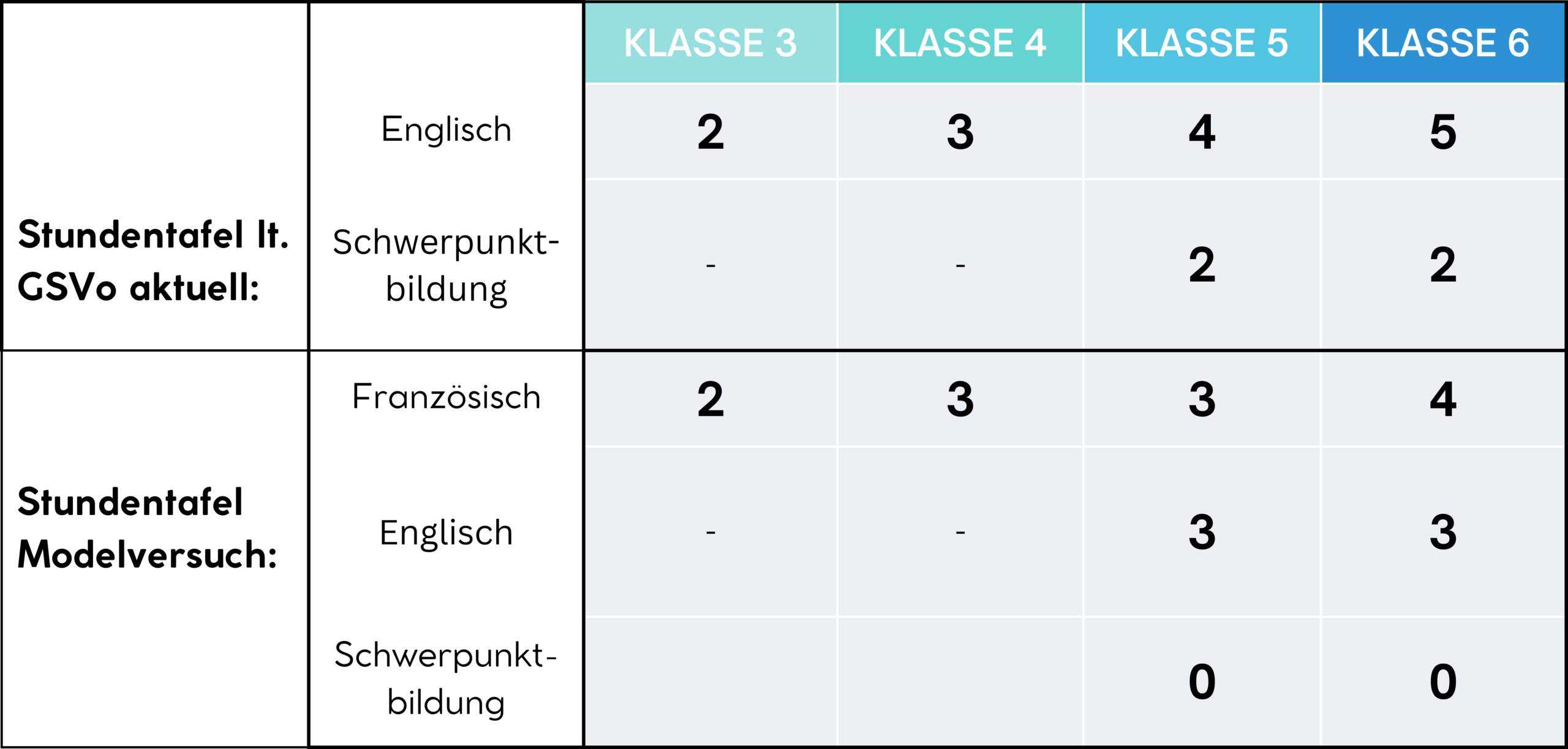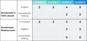 - Französisch wird mit einer Wochenstunde weniger unterrichtet (im Vergleich zur regulären Stundentafel).